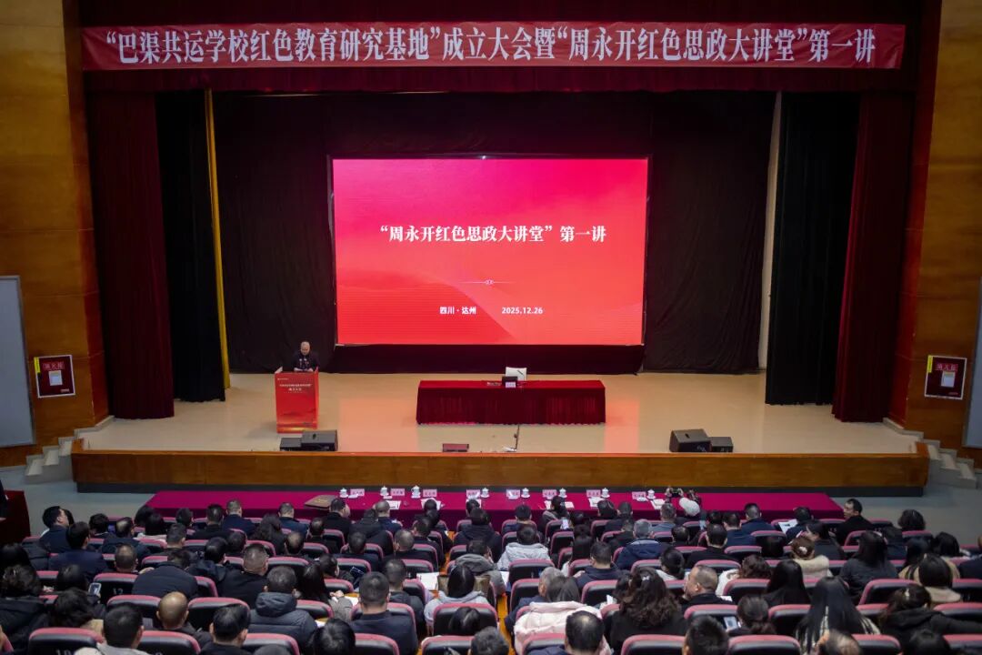 2025年12月26日上午,在纪念毛泽东同志诞辰132周年之际,四川文理学院艺术传媒大楼多功能厅庄重而热烈,“巴渠共运学校红色教育研究基地”成立大会暨“周永开红色思政大讲堂”第一讲在此隆重举行。本次活动由达州市委教育工委与四川文理学院联合主办,标志着川东北地区红色教育研究与实践迈向体系化、协同化、品牌化的新阶段。市级相关部门,巴中市、广安市委教育工委,原“巴渠共运友好学校联谊会”成员单位,大中小学思政课一...