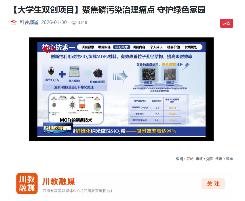 1月30日,四川教育新闻以“聚焦磷污染治理痛点 守护绿色家园”为题,报道我校大学生双创成果