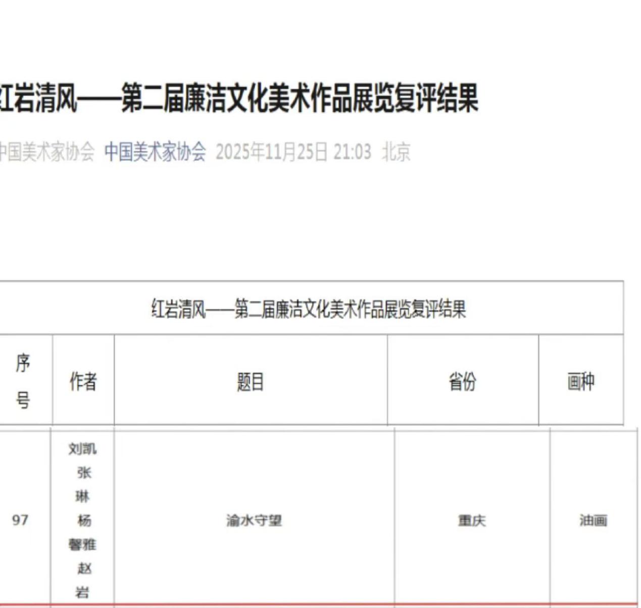 此外,我校美术学院赵岩联合创作的油画作品《渝水守望》通过复评,成功入选。本次创作是一次成功的跨校艺术协作,是中国美术家协会对该作品艺术水准与思想内涵的高度认可,也是我校美术学科建设与创作实力的重要体现。这不仅展现了我校教师出色的专业能力,也体现了高校间艺术资源共享、协同创新的良好局面。
