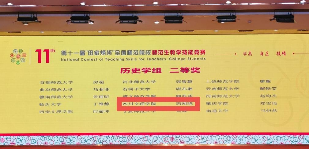 历史学专业选手唐闻晓在决赛中同样表现突出,在强手如林的竞争中沉着应战,展现出良好的师范素养与教学潜质,最终荣获二等奖,彰显了我校历史学专业人才培养的质量与实力。