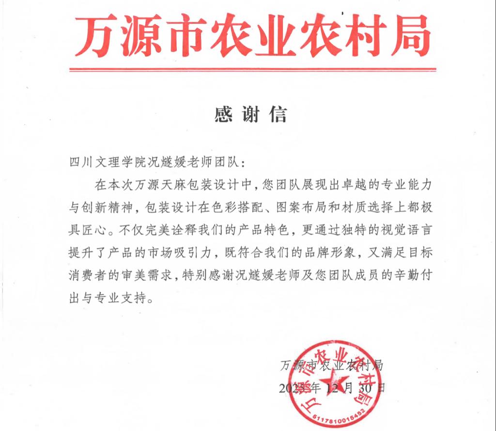 近日,万源市农业农村局向我校美术学院况燧媛老师团队发来感谢信,对其在万源天麻包装设计项目中展现的专业素养与创新精神给予高度赞誉。这一成果,既是团队专业能力的生动彰显,更是我校扎实推进帮扶工作、赋能乡村振兴的又一具体实践。