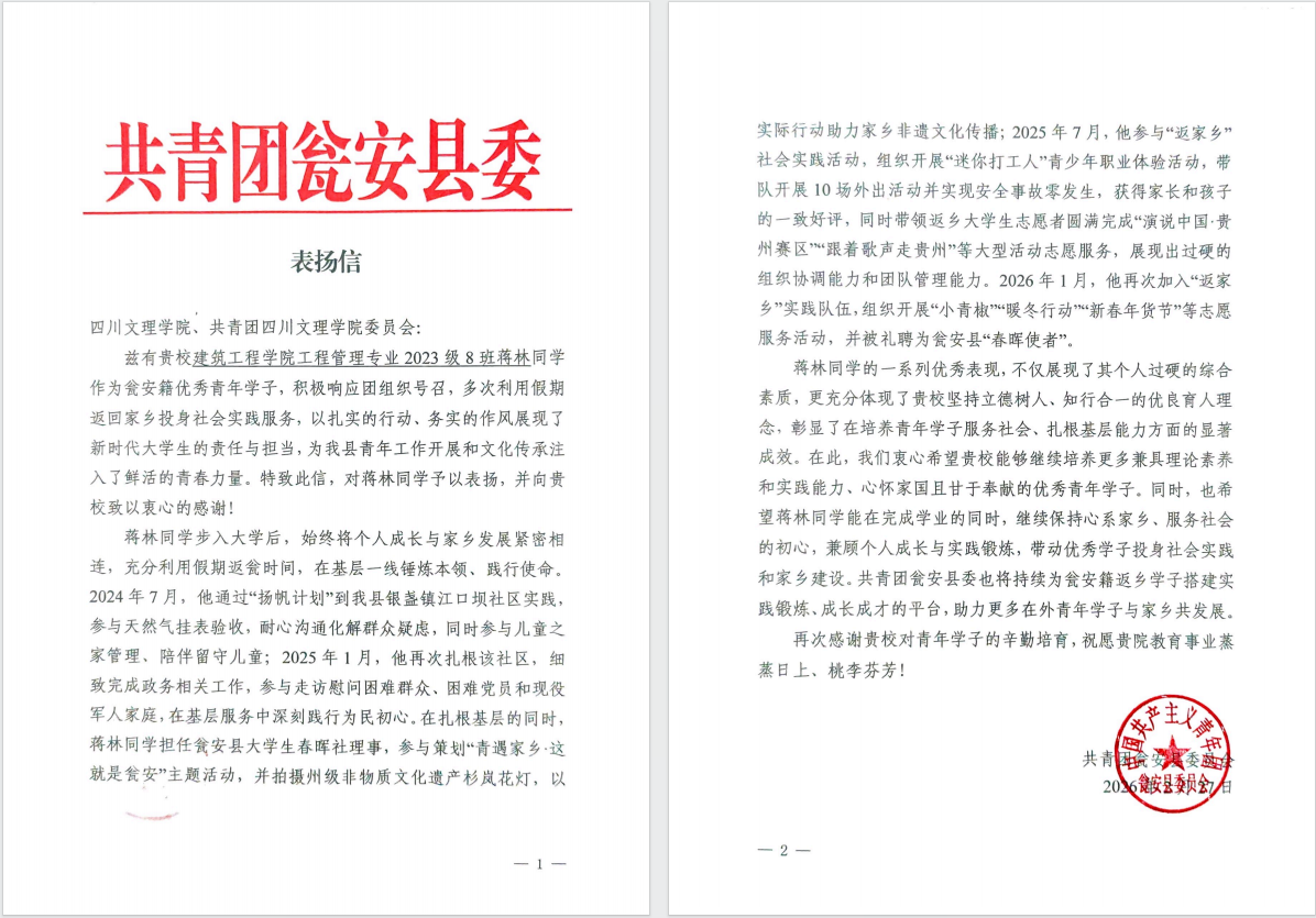 近日,我校收到共青团瓮安县委发来的表扬信,信中对我校建筑工程学院工程管理专业2023级8班蒋林同学多次利用假期返乡投身社会实践的优秀表现予以高度肯定和表扬,同时向学校致以衷心感谢。