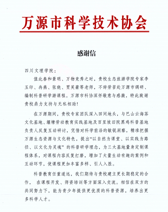 近日,万源市科学技术协会向我校发来感谢信,对生态旅游学院李玉印、冉燕、张晓、贾芙豪等专家团队在万源市调研编制科普研学课程中的辛勤付出与鼎力支持表示感谢。这是我校深化校地合作、服务地方发展的又一务实成果。