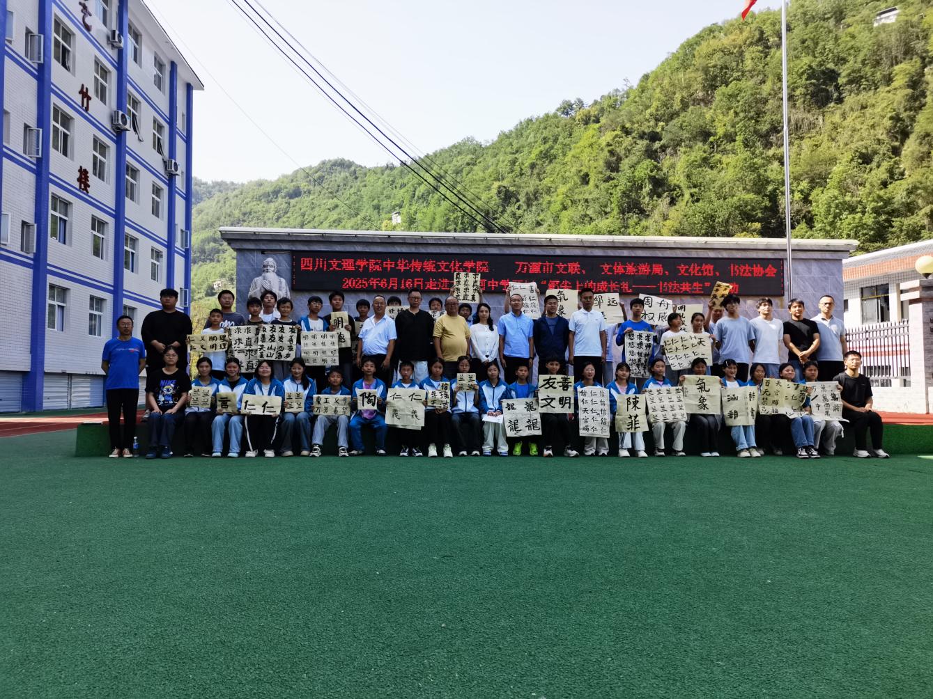 6月16日,我院书法教研室副主任郭岩、专业教师陆峰偕9名学生走进万源市大竹河中学,开展中小学书法浸润活动。