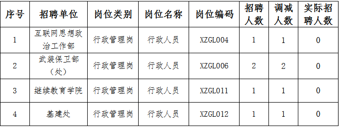 根据《四川文理学院2023年上半年行政管理人员招聘公告》规定,因部分招聘岗位的有效报考人数与招聘名额之比未达到规定的开考比例,现调减部分招聘岗位的招聘计划,合计取消4个岗位5个计划。具体调减情况如下。