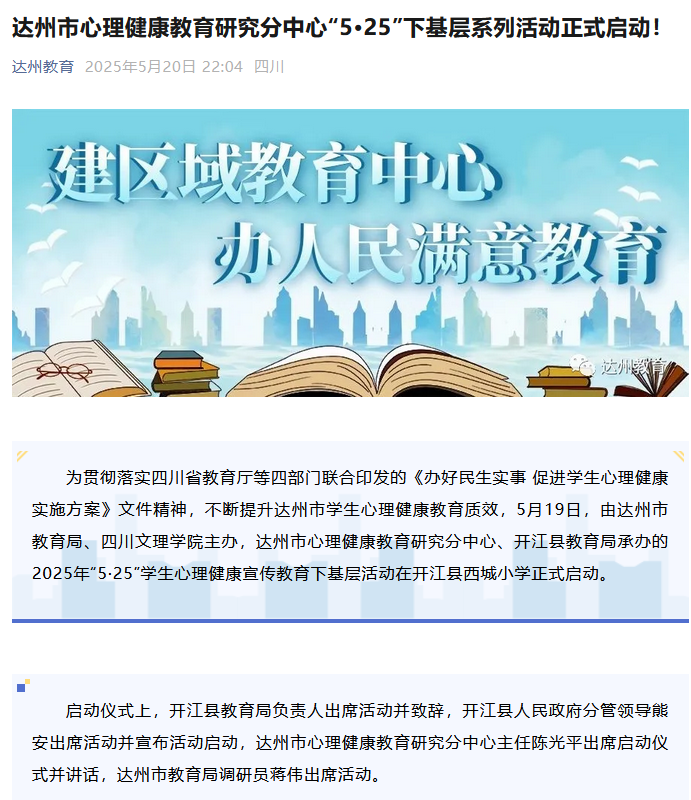 为贯彻落实四川省教育厅等四部门联合印发的《办好民生实事 促进学生心理健康实施方案》文件精神,不断提升达州市学生心理健康教育质效,5月19日,由达州市教育局、四川文理学院主办,达州市心理健康教育研究分中心、开江县教育局承办的2025年“5·25”学生心理健康宣传教育下基层活动在开江县西城小学正式启动。