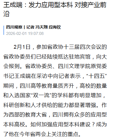 2月1日,参加省政协十三届四次会议的省政协委员们已经陆续抵达驻地宾馆,向大会报到。省政协委员、四川文理学院原党委书记王成端在采访中向记者表示,“十四五”期间,四川高等教育量质齐升,高校的数量和入选国家“双一流”的学科都有明显增加,科研创新和人才供给的能力都显著增强。作为西部的教育大省,四川拥有众多的应用型本科高校。如何加强应用型本科建设?成为了他在今年省两会上关注的重点。