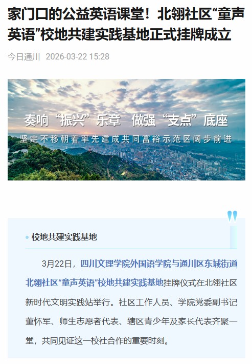 3月22日,四川文理学院外国语学院与通川区东城街道北翎社区“童声英语”校地共建实践基地挂牌仪式在北翎社区新时代文明实践站举行。社区工作人员、学院党委副书记董怀军、师生志愿者代表、辖区青少年及家长代表齐聚一堂,共同见证这一校社合作的重要时刻。