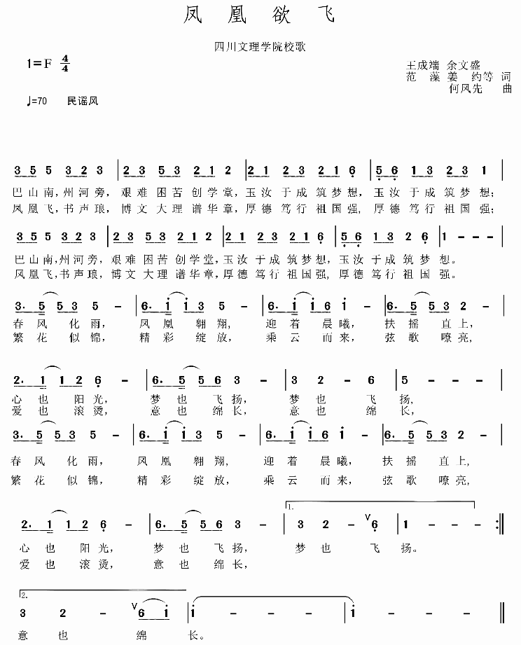 四川文理学院校歌《凤凰欲飞》,2017年9月完成词曲创作,在四川省第八届大学生艺术节上获专业组一等奖,在第十四届中国合唱节上获银奖。凤凰在汉文化中是吉祥、勇敢、和谐、幸福的化身,是刚强勇敢、才智超群、幸福美满、生生不息的象征。《凤凰欲飞》取凤凰在浴火中重生,积蓄足够能量,意欲展翅翱翔于九天之势,喻指四川文理学院如同凤凰翔集的梧桐林,千万学子云集于斯,师生同心同德,笃行博文大理、厚德笃行的校训,经风沐雨,为祖国富强、社会进步,呕心历胆,谱写生命华章。曲词分为两章,第一章叙写学校地理区位和办学缘起,以及源远流长的办学历史和悠久的文化底蕴;第二章表达学校的办学理念,人才培养目标和文理交融的理想人才标准;结尾部分抒写文理学子对母校的感恩之情与对灿烂如花的未来的无限憧憬。《凤凰欲飞》由党委书记王成端与余文盛、范藻、姜约等集体作词,音乐与演艺学院何凤先作曲。