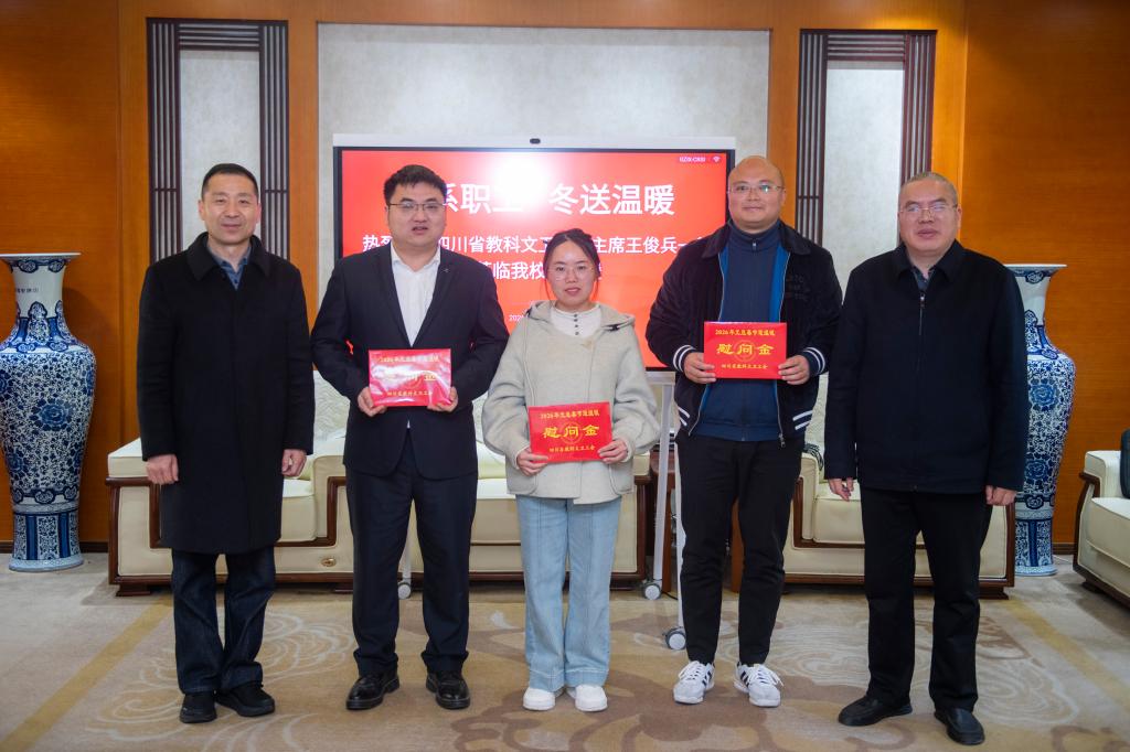 1月15日,省教科文卫工会主席王俊兵、省教科文卫工会四级调研员郭佳、达州市教育工会主席王国炜一行来校开展2026年元旦春节“送温暖”慰问活动,向优秀团队成员送上节日问候与慰问金。学校党委副书记、工会主席徐晓宗,校工会常务副主席严庄陪同。