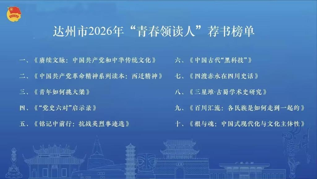 书单公布:推荐优质书目。达州市2026年“青春领读人”荐书榜单正式发布。十本好书覆盖党史精神、古代科技、文化脉络、民族共识等多个领域,串联起革命精神、科技智慧与文化根脉,每一本都是青年成长路上的精神灯塔。