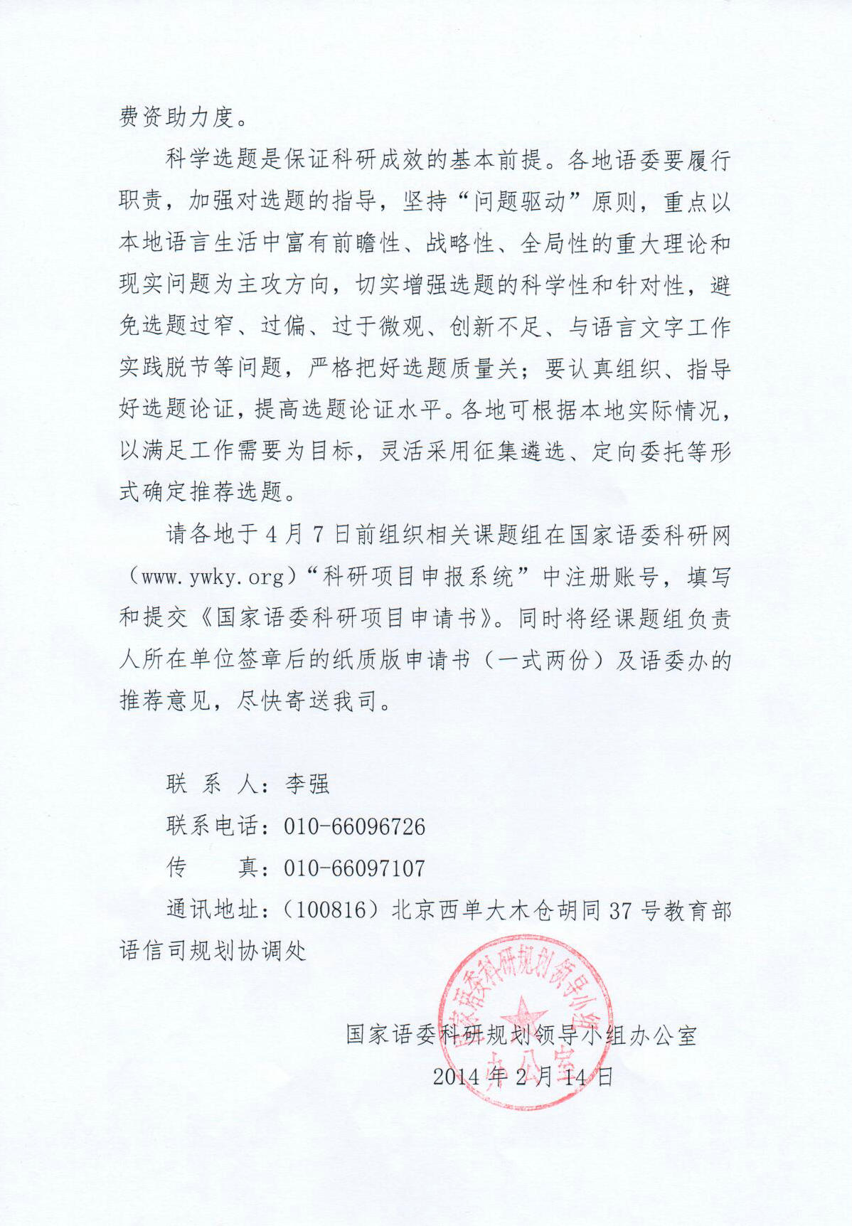现将国家语委科研规划领导小组办公室《关于推荐国家语委科研课题的通知》转发给你们,请按照文件要求组织申报,并于3月28日前将单位签章后的纸质版申请书(一式两份)交至莲湖校区行政楼2019办公室,同时将电子版申请书发送至397874519@qq.com。