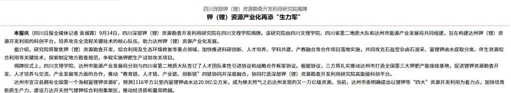9月14日,四川深部钾(锂)资源勘查开发利用研究院在四川文理学院揭牌。该研究院由四川文理学院、四川省第二地质大队和达州市能源产业发展局共同组建,旨在构建达州钾(锂)资源开发利用的科创平台,培养攻克全流程关键技术的核心队伍,助力达州钾(锂)资源产业化发展。