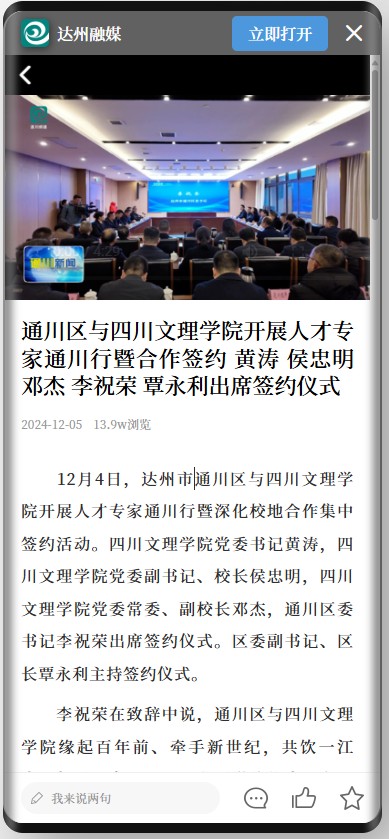 黄涛指出,四川文理学院始终秉持“博文大理,厚德笃行”的校训精神,始终坚守立足地方、服务区域的办学理念,紧密围绕地方经济社会发展需求,积极探索校地合作的创新模式与有效路径,持续优化资源配置,不断提升自身服务地方经济社会发展的能力与水平,为地方建设贡献力量。此次深化合作协议的签署,是校地双方在新时代背景下,为实现更高质量发展而作出的重要战略决策,对于推动通川区产业升级、创新驱动发展以及学校教育教学改革、人才培养质量提升具有深远意义。深化校地合作是时代赋予我们的共同使命,也是实现校地双方高质量发展的必然选择。我们真诚希望通过校