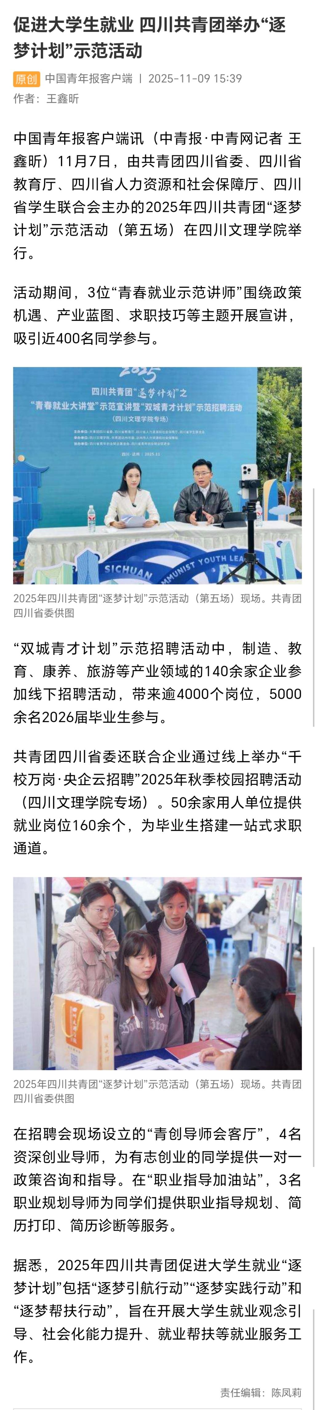 据悉,2025年四川共青团促进大学生就业“逐梦计划”包括“逐梦引航行动”“逐梦实践行动”和“逐梦帮扶行动”,旨在开展大学生就业观念引导、社会化能力提升、就业帮扶等就业服务工作。