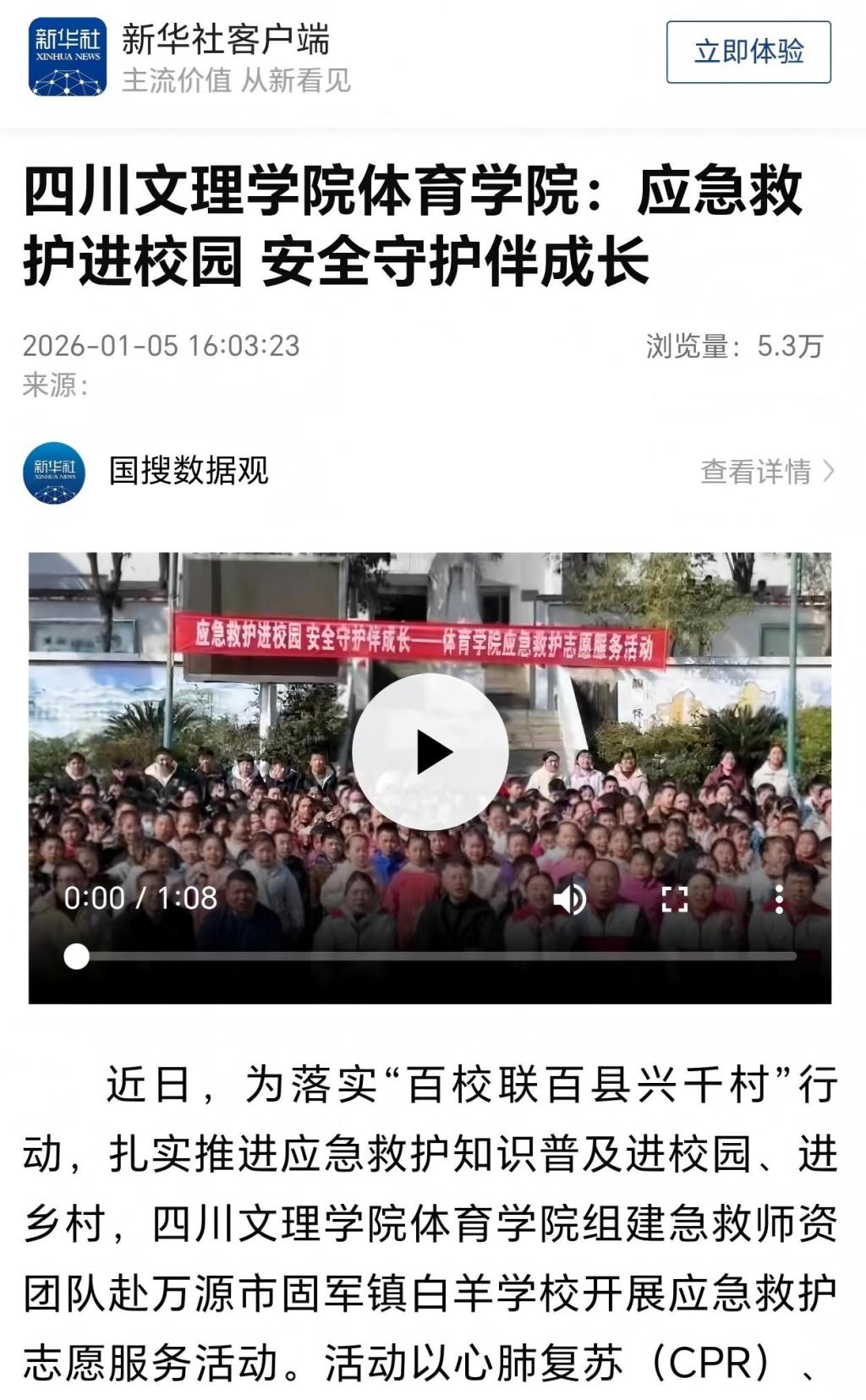 近日,我校体育学院组织专业师资团队赴万源市固军镇白羊学校开展的应急救护志愿服务活动,获新华社专题报道,引发良好社会反响。此次活动是我校深入贯彻落实“百校联百县兴千村”行动、扎实推进乡村振兴帮扶工作的又一务实举措。