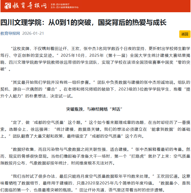 “这枚奖牌,不仅镌刻着田沚仟、王欢、张中杰3名同学数百个日夜的坚持,更折射出学校师生勤学笃行、守正创新的坚实足迹。”2025年10月,2025年(第十一届)全国大学生统计建模大赛结果揭晓,四川文理学院数学学院教师徐远带领的学生团队,实现了学校在该项全国顶级赛事中国奖“零的突破”。