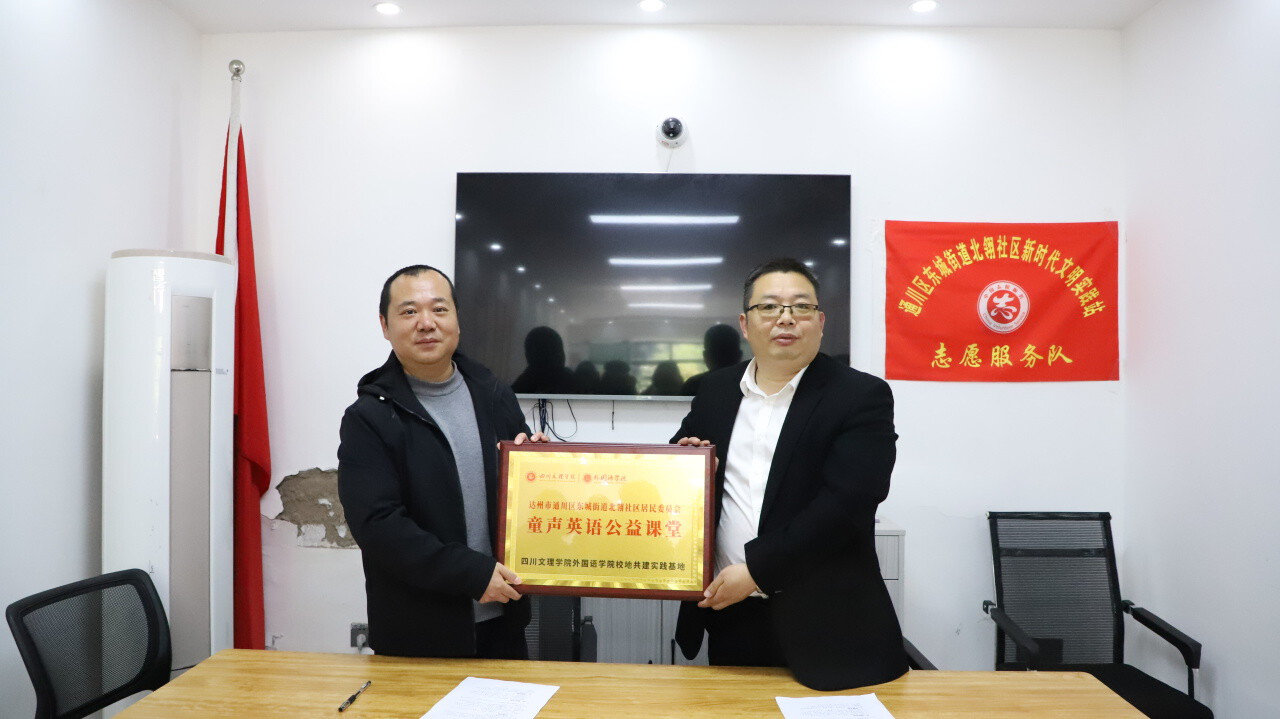 3月22日,四川文理学院外国语学院与通川区东城街道北翎社区“童声英语”校地共建实践基地挂牌仪式在北翎社区新时代文明实践站举行。社区工作人员、学院党委副书记董怀军、师生志愿者代表、辖区青少年及家长代表齐聚一堂,共同见证这一校社合作的重要时刻。
